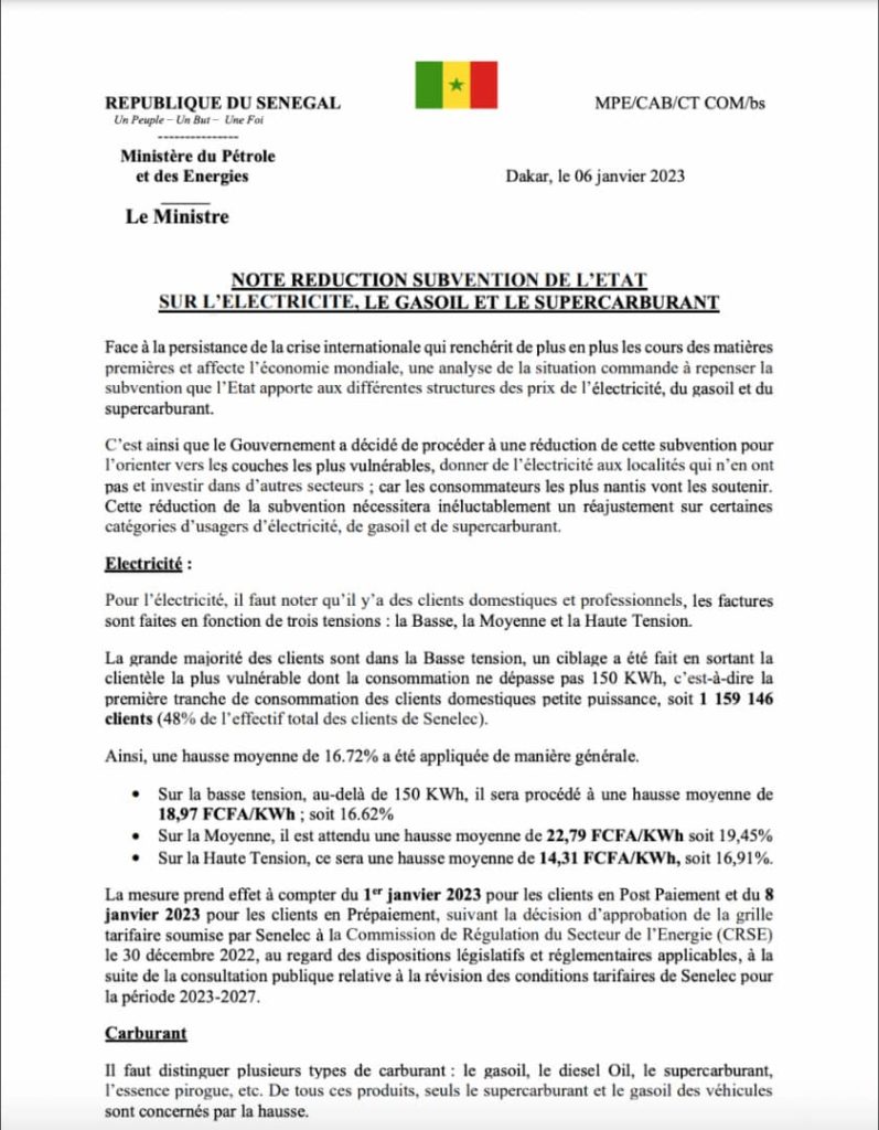 " />1- Électricité, carburant : L’Etat officialise ses hausses (Document officiel)