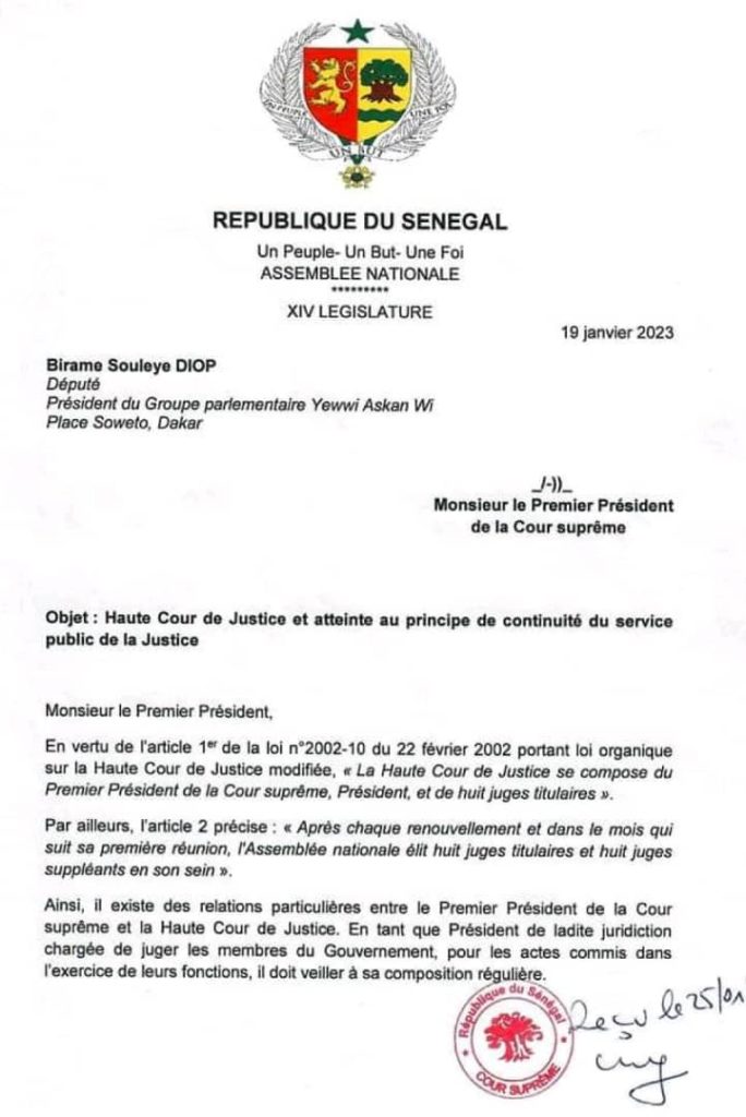 «Nous tenons à vous informer que depuis le renouvellement de l’Assemblée nationale suivi de l’installation de la XIVe législature le 12 septembre 2022, le Président de l’Assemblée nationale, malgré l’interpellation des députés, refuse de convoquer l’Assemblée nationale pour l’élection de seize (16) nouveaux juges membres de la Haute Cour de Justice», a déclaré le député Birame Souleye Diop dans sa correspondance envoyée au premier président de la Cour suprême (voir ci-dessous).