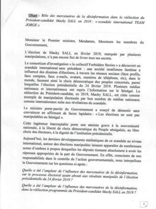 1- question d’actualité portant sur le rôle des mercenaires de la désinformation dans la réélection du président-candidat Macky Sall en 2019: « scandale international TEAM JORGE »