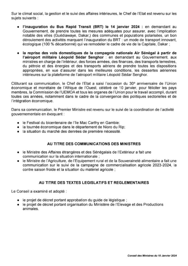 " /> Communiqué du Conseil des ministres du mercredi 10 janvier 2024 Publié le 10 Jan, 2024 À DÉCOUVRIR Communiqué du Conseil des ministres du mercredi 1er octobre… 2 Oct, 2025 La Rédaction de SenCaféActu Partager ->