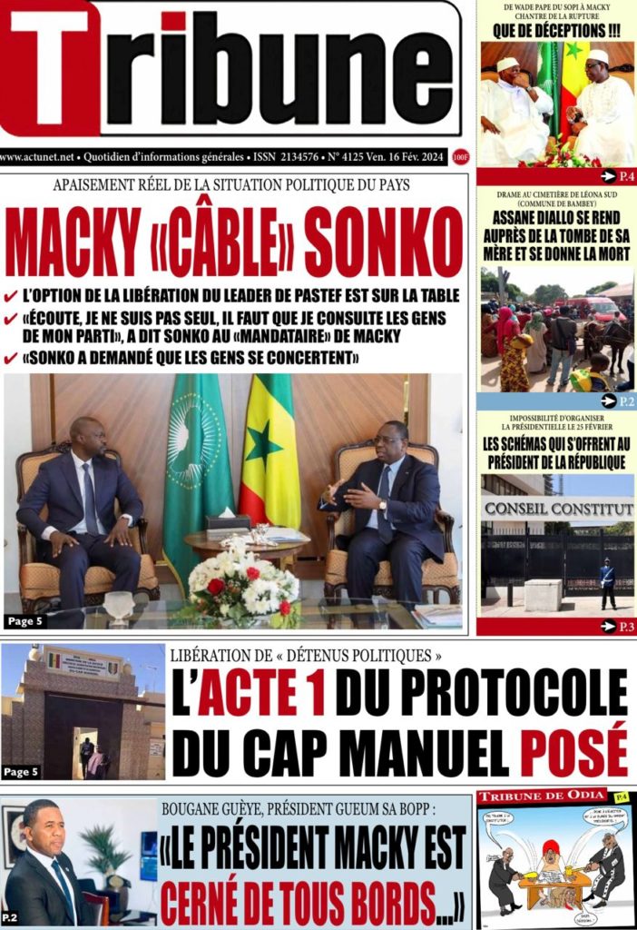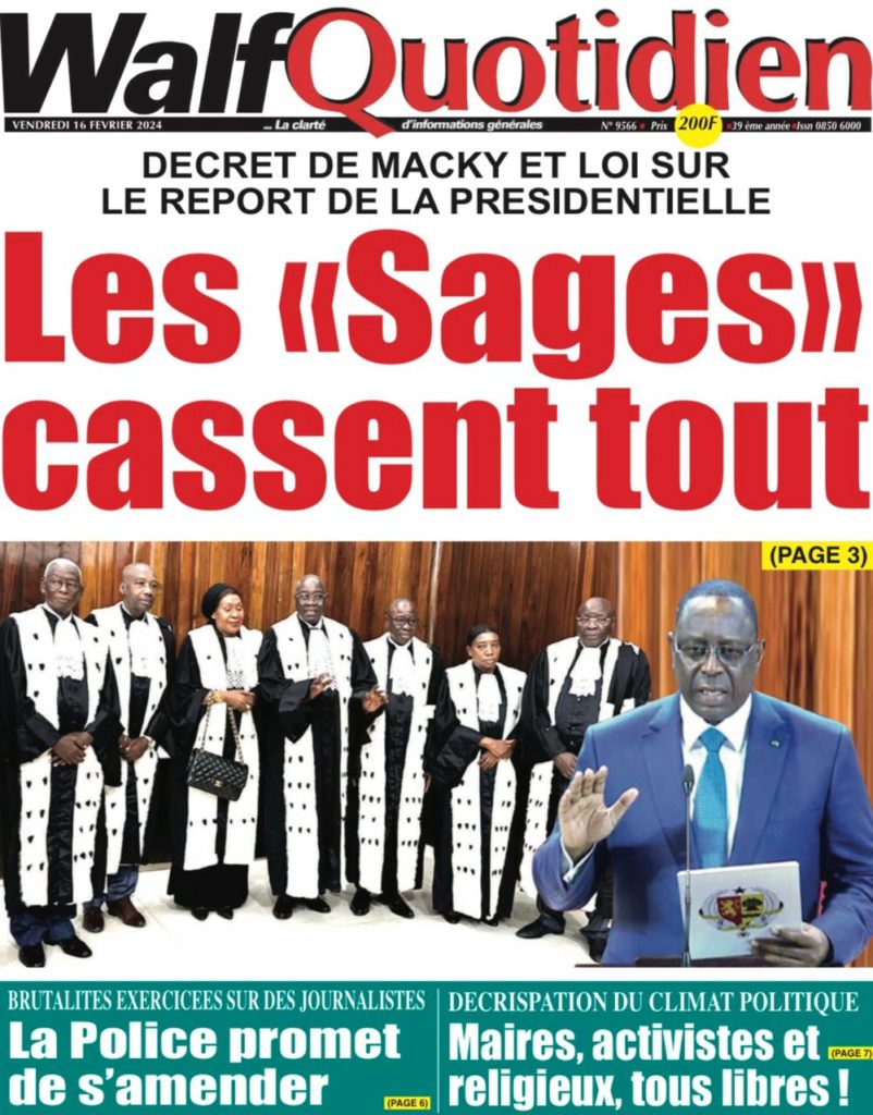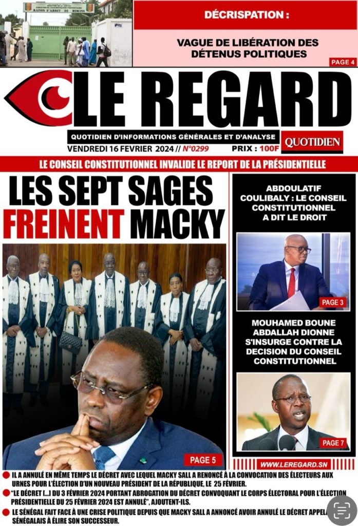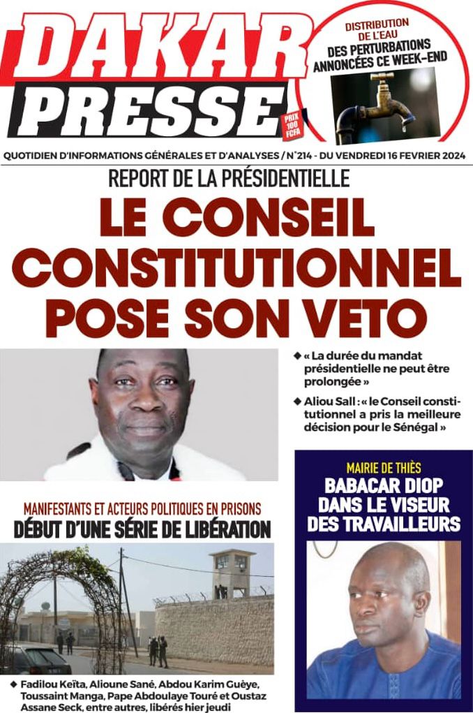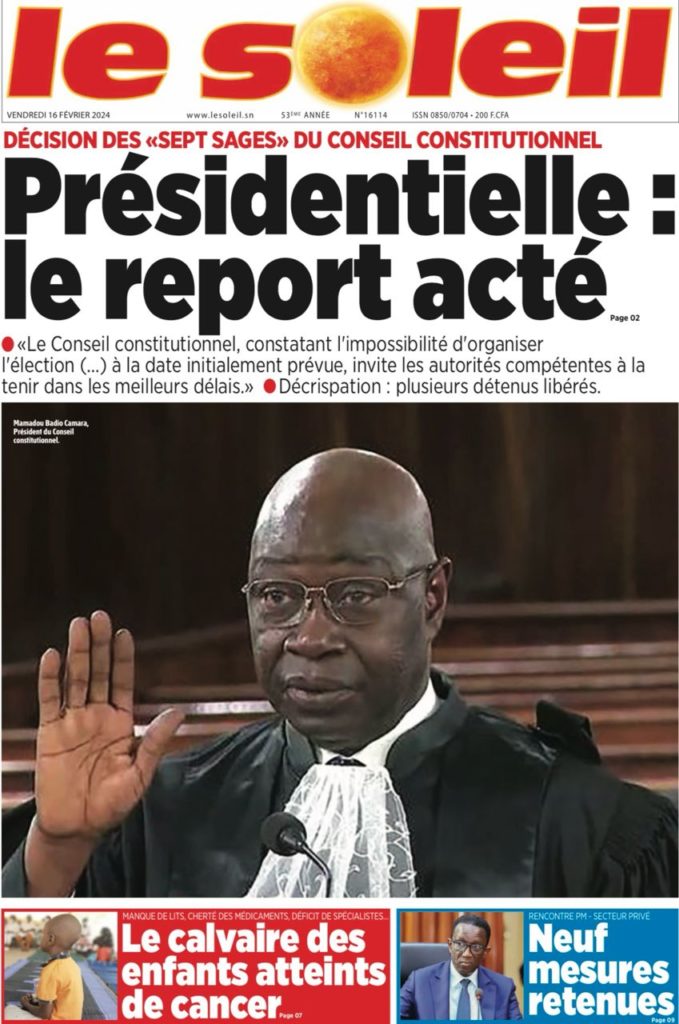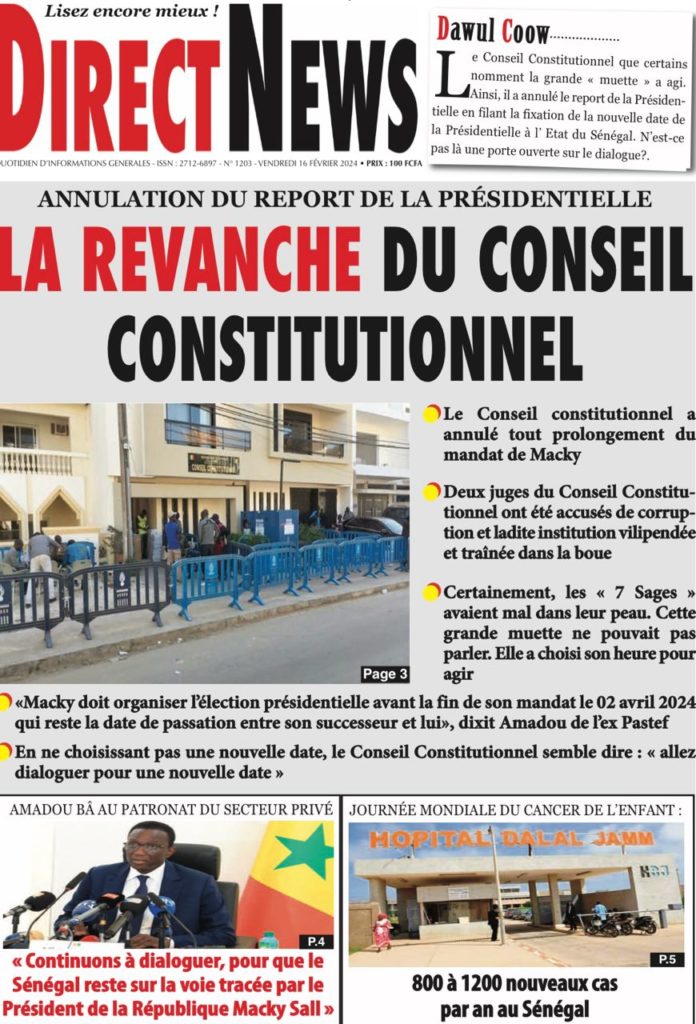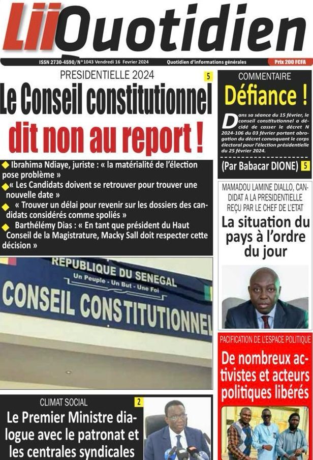 " /> La Une des Quotidiens Nationaux du 16 Février 2024 Publié le 16 Fév, 2024 À DÉCOUVRIR Les Unes des quotidiens nationaux du 21 novembre 2025 21 Nov, 2025 La Rédaction de SenCaféActu Partager ->