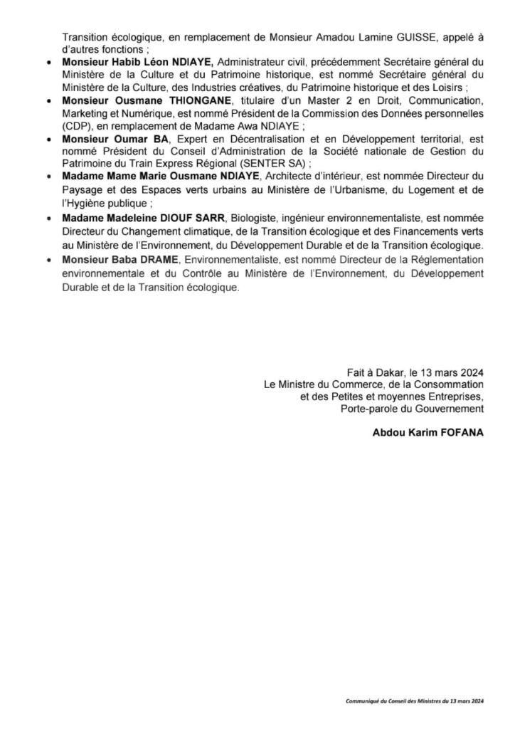 " /> COMMUNIQUÉ DU CONSEIL DES MINISTRES DU MERCREDI 13 MARS 2024 Publié le 13 Mar, 2024 À DÉCOUVRIR Communiqué du Conseil des ministres du mercredi 12 novembre… 12 Nov, 2025 La Rédaction de SenCaféActu Partager ->