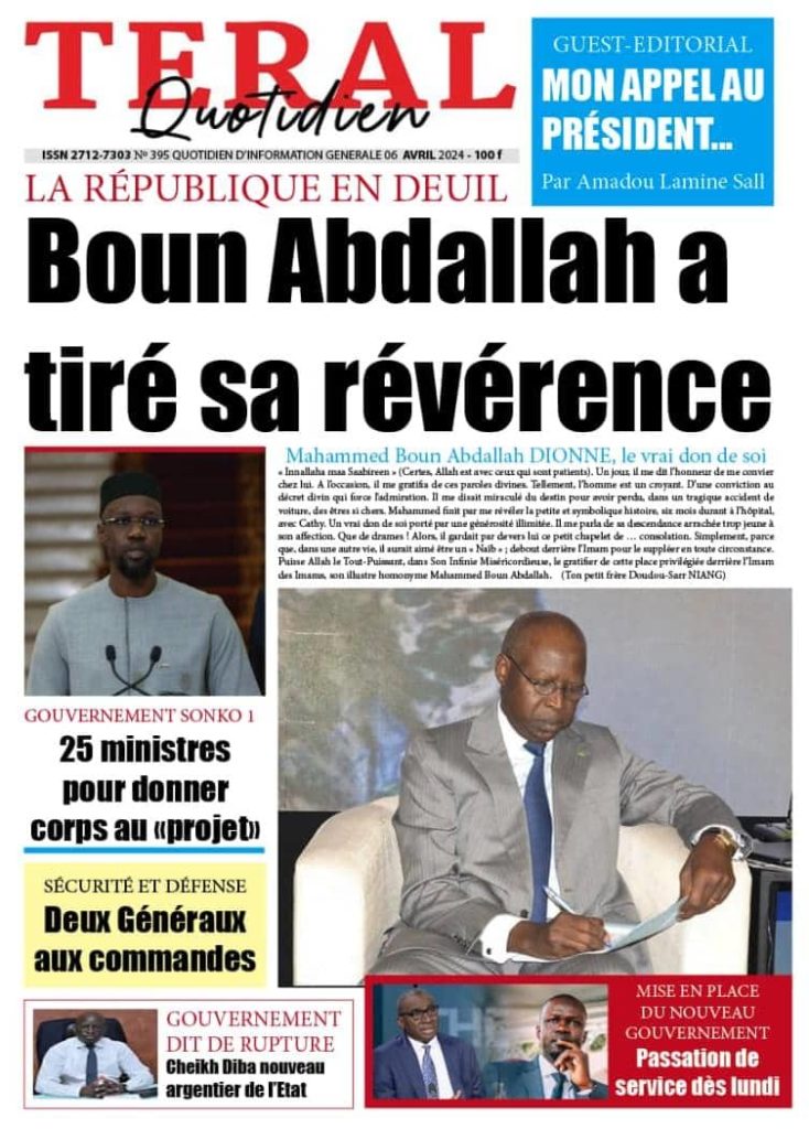 " /> La Une des Quotidiens Nationaux du 6 Avril 2024 Publié le 6 Avr, 2024 À DÉCOUVRIR Les Unes des quotidiens nationaux du 07 novembre 2025 7 Nov, 2025 La Rédaction de SenCaféActu Partager ->