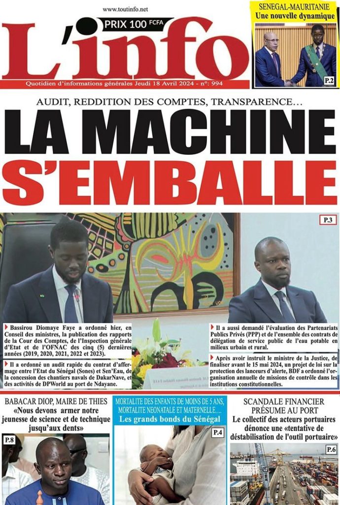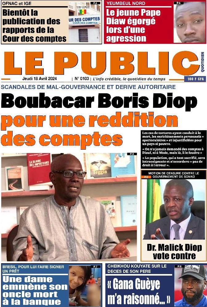 " /> La Une des Quotidiens Nationaux du 18 Avril 2024 Publié le 18 Avr, 2024 À DÉCOUVRIR Les Unes des quotidiens nationaux du 30 octobre 2025 30 Oct, 2025 La Rédaction de SenCaféActu Partager ->