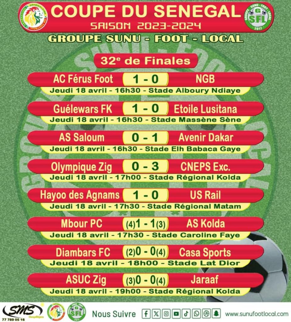 • Coupe du Sénégal – 32ᵉ de finale : Les résultats des rencontres du 18 Avril 2024