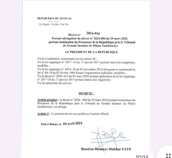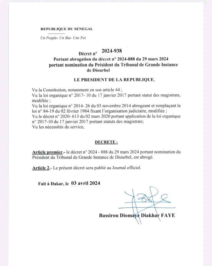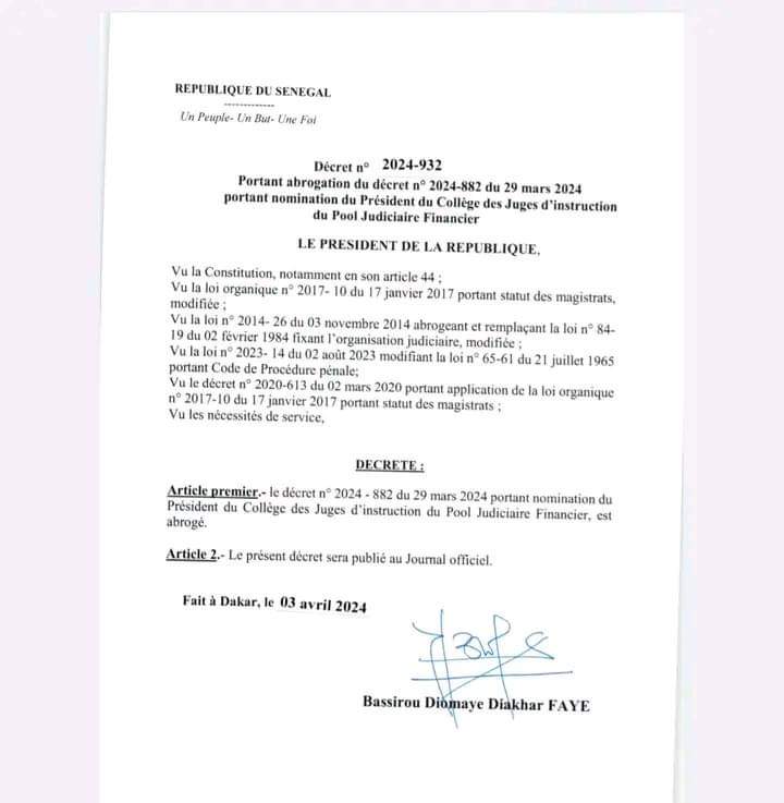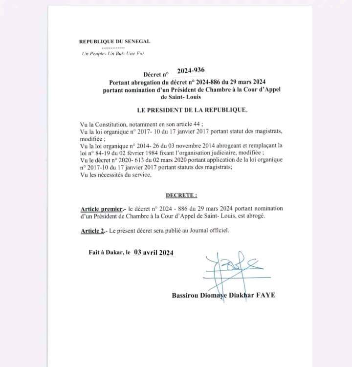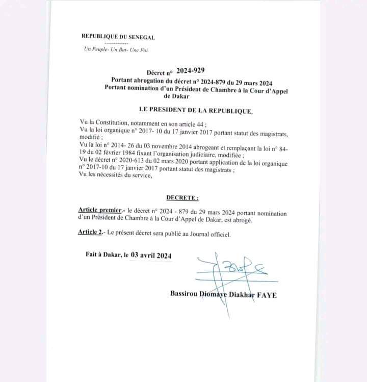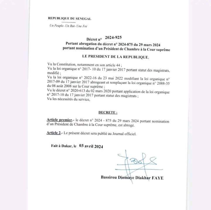 Le président de la République, Bassirou Diomaye Faye, a bel et bien abrogé les décrets pris le 29 mars 2024 par Macky Sall, à l’issue de la dernière réunion du Conseil supérieur de la magistrature (CSM).