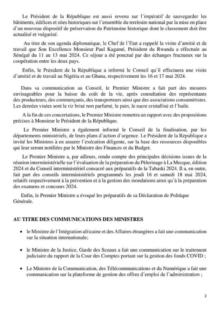 " /> COMMUNIQUE DU CONSEIL DES MINISTRES DU MERCREDI 15 MAI 2024 Publié le 15 Mai, 2024 À DÉCOUVRIR Communiqué du Conseil des ministres du mercredi 1er octobre… 2 Oct, 2025 La Rédaction de SenCaféActu Partager ->