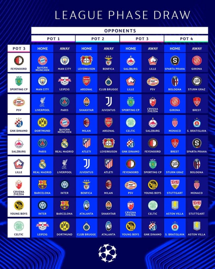 L’UEFA a procédé, ce jeudi à Monaco, au tirage au sort de la phase de ligue de la Ligue des champions 2024-2025. Pour la première édition de la prestigieuse compétition après la refonte du format, les 36 qualifiés seront placés dans un championnat unique et y joueront huit matchs secs contre huit adversaires différents. Le calendrier précis de cette première phase de la compétition doit être révélé ce samedi.