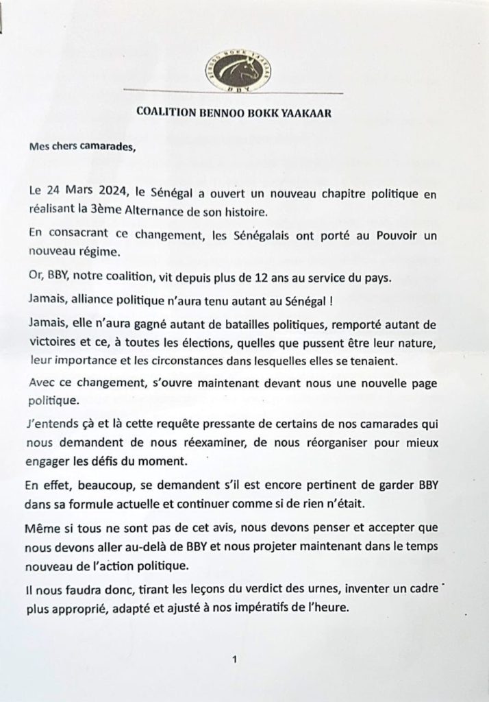 Dans une lettre adressée à ses camarades de la coalition Bennoo Bokk Yaakaar (BBY) ce 2 septembre 2024, parvenue par Senego, l’ancien président sénégalais Macky Sall a évoqué la nécessité de reconsidérer l’avenir de cette alliance politique à la lumière des récents développements sur la scène politique du pays.