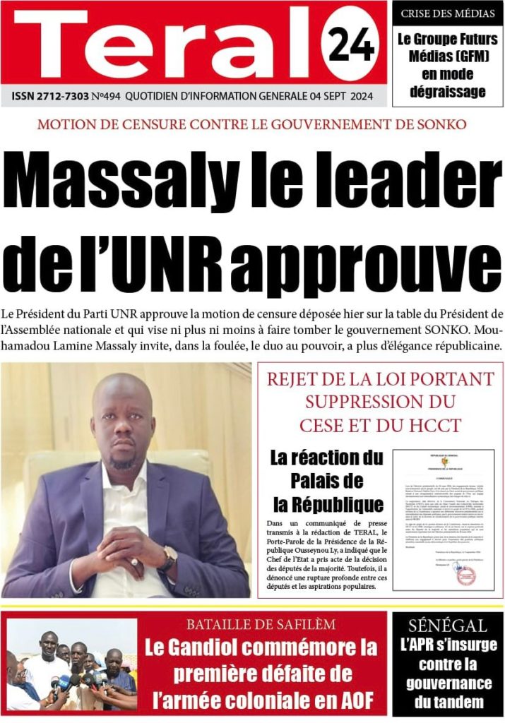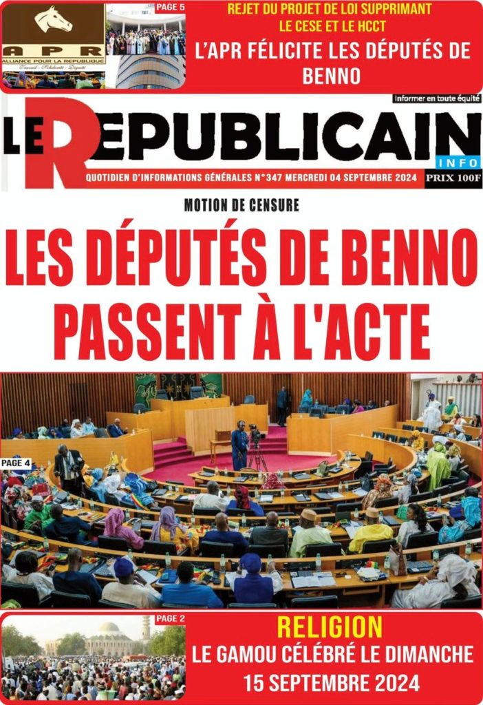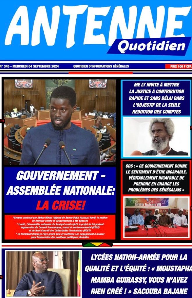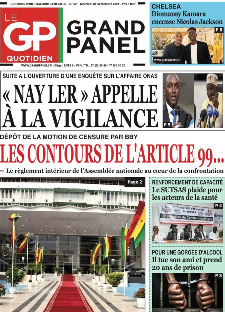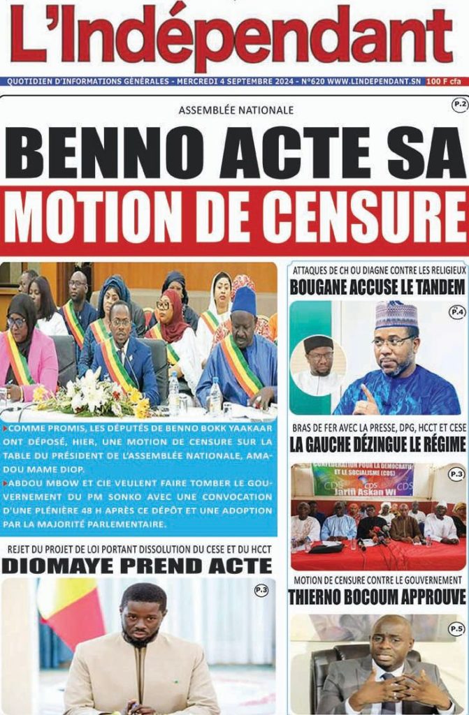 " /> La Une des Quotidiens Nationaux du 4 Septembre 2024 Publié le 4 Sep, 2024 À DÉCOUVRIR Les Unes des quotidiens nationaux du 15 novembre 2025 15 Nov, 2025 La Rédaction de SenCaféActu Partager ->