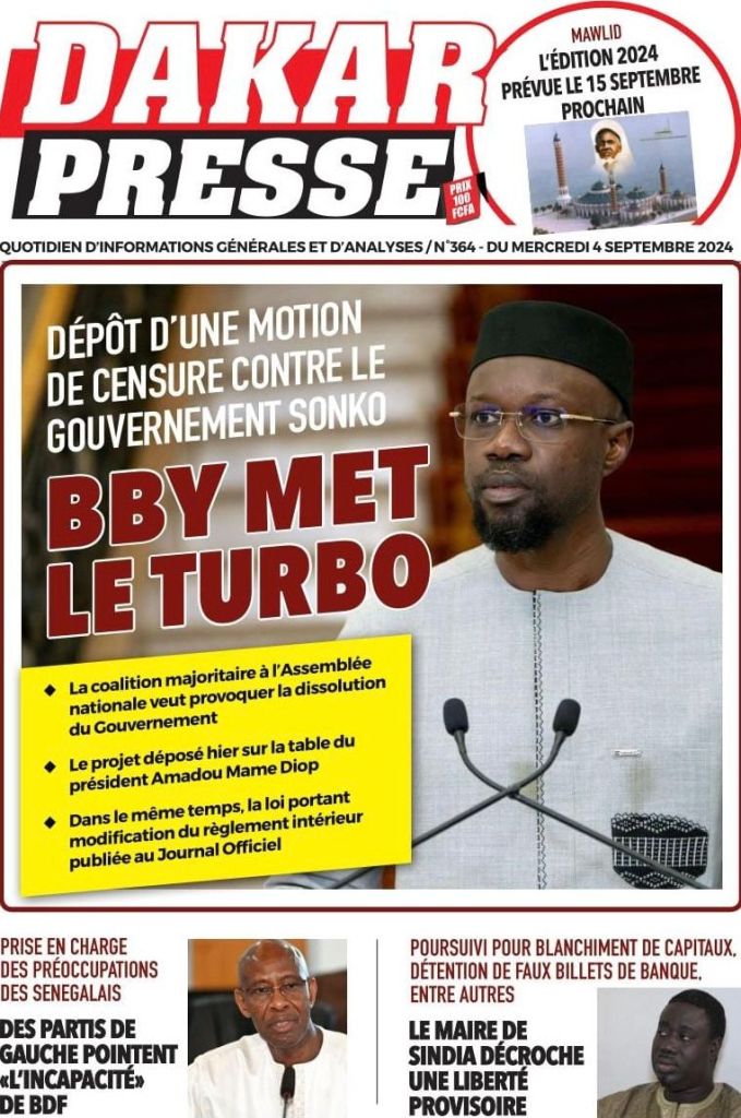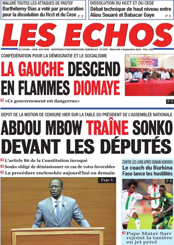 " /> La Une des Quotidiens Nationaux du 4 Septembre 2024 Publié le 4 Sep, 2024 À DÉCOUVRIR Les Unes des quotidiens nationaux du 11 octobre 2025 11 Oct, 2025 La Rédaction de SenCaféActu Partager ->