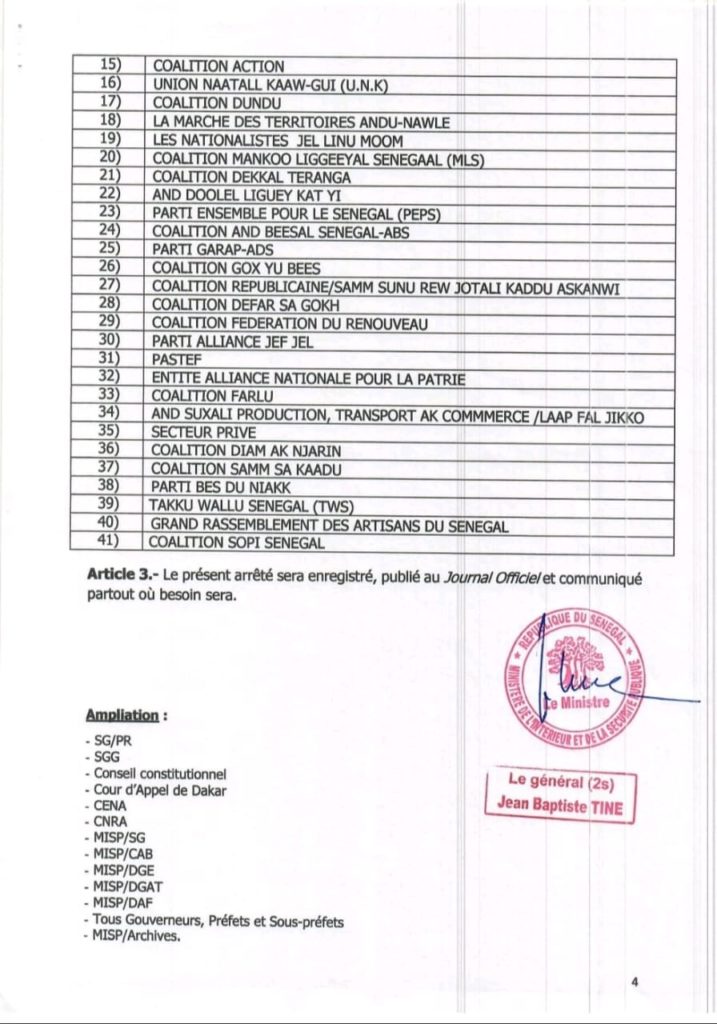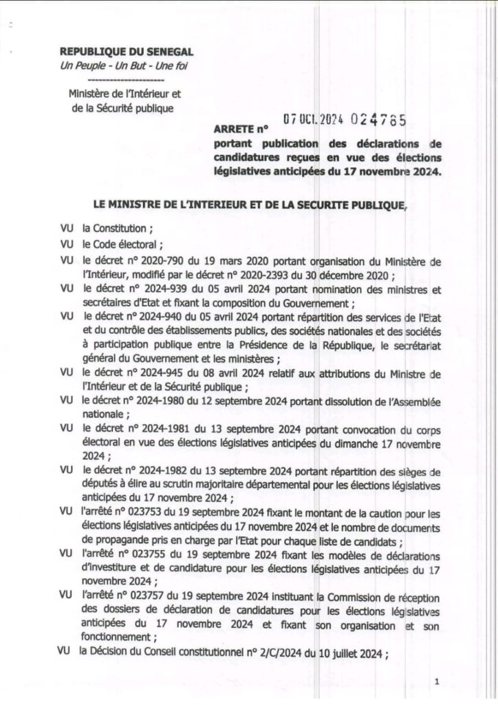 La requête déposée au Conseil constitutionnel est accompagnée de l’arrêté n° 024785 du 7 octobre 2024 portant publication des déclarations de candidatures reçues en vue des élections législatives anticipées du 17 novembre 2024 et de la liste des titulaires de PASTEF au scrutin proportionnel.